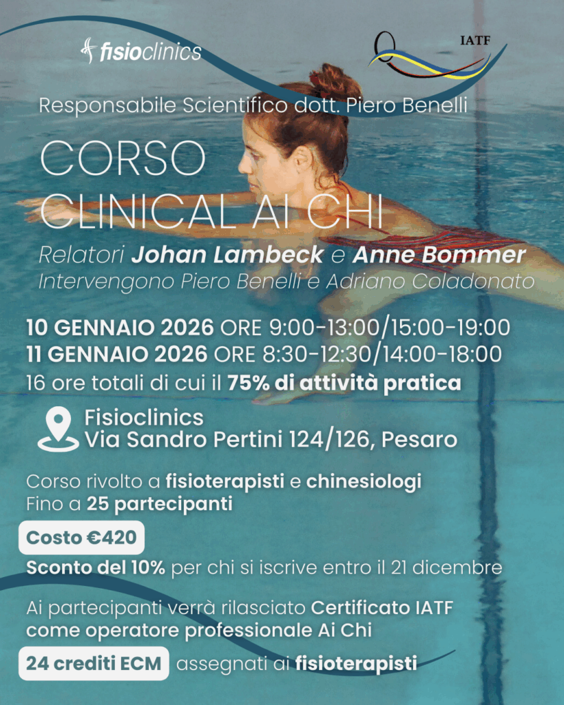 Il Clinical Ai Chi è un metodo terapeutico in acqua che integra movimento lento, respirazione e consapevolezza corporea. Evoluzione dell’Ai Chi tradizionale, applica i principi del Tai Chi all’ambiente acquatico, diventando uno strumento utile nella riabilitazione grazie ai suoi effetti su equilibrio, postura, mobilità e controllo neuromotorio.